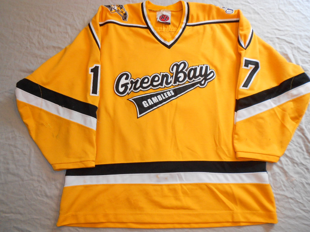 Loading... Please wait...Striking gold color jersey that is tagged size XL in collar. Front has the crest sewn on. Both sleeves show nice wear with boardburns, stickmarks and the right sleeve showing two repairs. Back of jersey shows very nice interior pilling and the fightstrap is still intact.