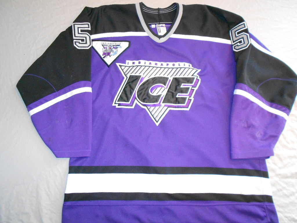 Loading... Please wait...Very nice IHL Indy jersey that is tagged size 54 in collar. Front has a great puckered crest with many stickmarks on lower hem. Both sleeves have very nice wear with stickmarks and boardburns and the left having two team repairs. Back of jersey shows the fighstrap is still intact and shows pilling on the inside.