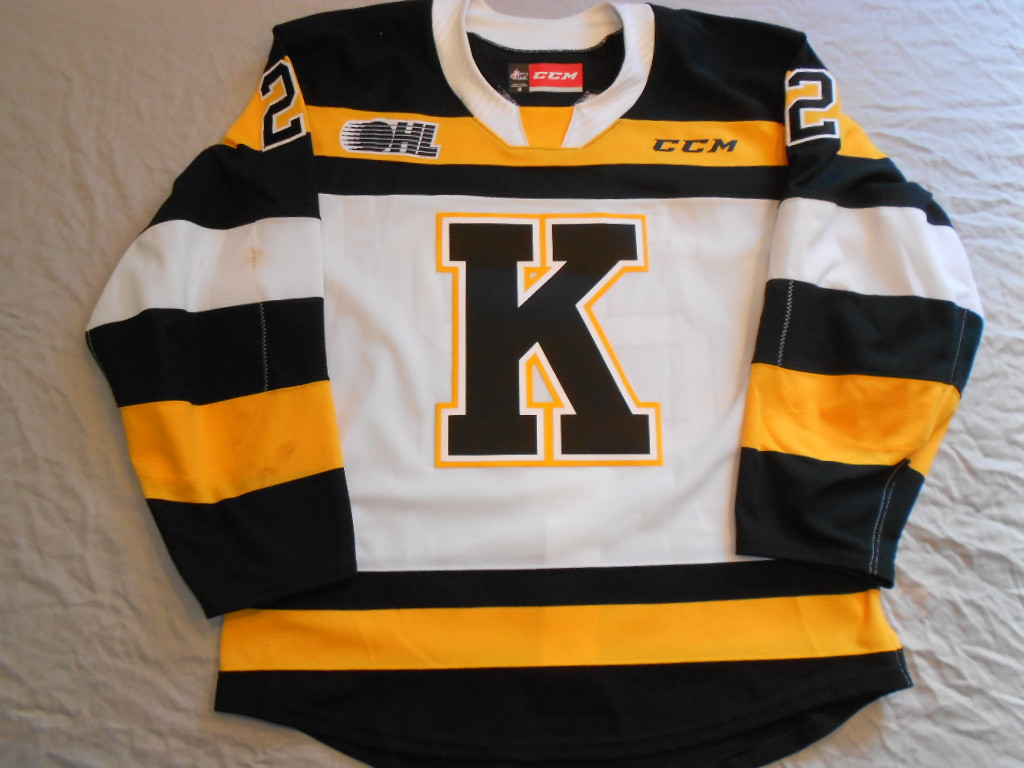 Loading... Please wait...Great looking alternate jersey tagged by CCM in the collar size 54. Front has a few material pulls on lower hem. Right sleeve shows some boardburns and stickmarks. Back of jersey has a couple stickmarks, some red dasher paint and the fightstrap is still intact.