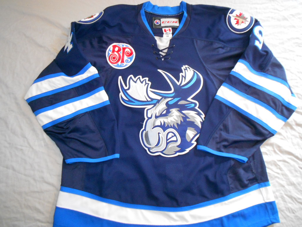 Loading... Please wait...Moose do their jerseys right, very nice looking sweater that is tagged size 56 in collar. Front has awesome looking crest and Boston Pizza patch sewn on. Both sleeves show a boardburn and the back of jersey has the fightstrap still intact. Comes with an LOA from the team.