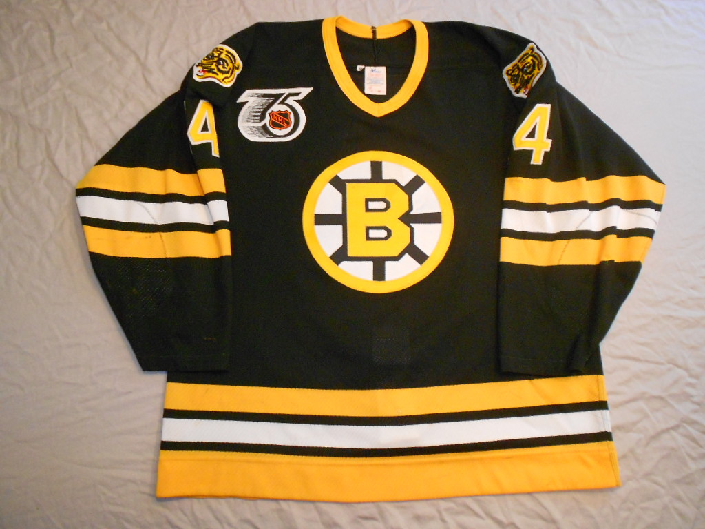 Old School Bruins jersey with the 75th patch tagged size 50 in collar. Front has a few material abrasions above crest and some loos threads on a somewhat puckering crest with a few light stickmarks on lower hem area. Both sleeves show nice wear with the left sleeve having two team repairs and the right sleeve three team repairs. Back of jersey has some loose threads on the numbers and the fightstrap is still intact. A nice vintage gamer...!