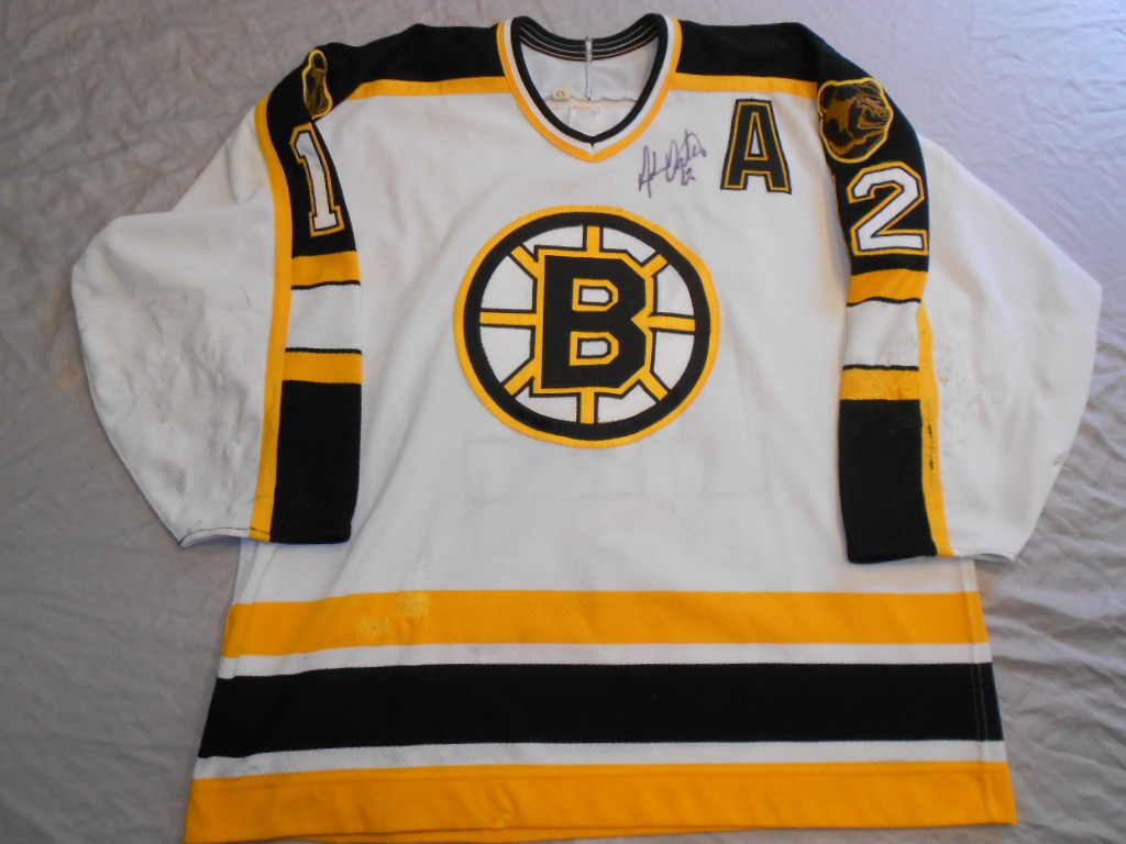 Where do you start with this jersey! Repairs on top of repairs would be the proper place! Jersey is tagged size 52 in collar and has the "A" sewn on chest. Repair to the right of the "A" in the black above the Bears head is photomatched to the image shown. Front has four team repairs on lower hem area. Both sleeves have been shortened and show repairs on top of repairs as the images show. Inside of jersey shows an abundance of pilling and the fightstrap has been cutout. You will be hard pressed to find a more hammered repaired jersey than this Hall of Fame offering. Comes with photo of the match and a personal signed letter from the collection of Hall of Famer Rogie Vachon.