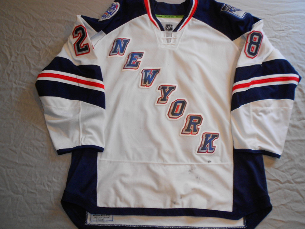 Loading... Please wait...Outstanding looking Stadium Series jersey used both games during the second period January 26th vs the Devils and January 29th vs the Islanders both wins for the Rangers. Tagged size 56 in collar with a matching Steiner sticker on tag, front has some very nice wear consisting of black marks photomatched to the image shown. Jersey has a few loose thread on back numbers and the fightstrap is intact and marked with the number 2. Comes with original LOA from Steiner and a photo of the match also has the MeiGray Tag in hem stating used in period 2 of both games.
