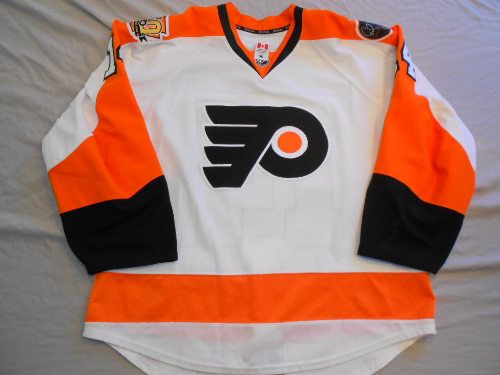 Loading... Please wait...Sweet looking two patch jersey of the Flyers current Captain tagged size 56 in collar. Front has a few stickmarks on lower hem and some boardburns on sleeves. Back of jersey shows fightstrap is still intact. Comes with original LOA from the MeiGray Group.