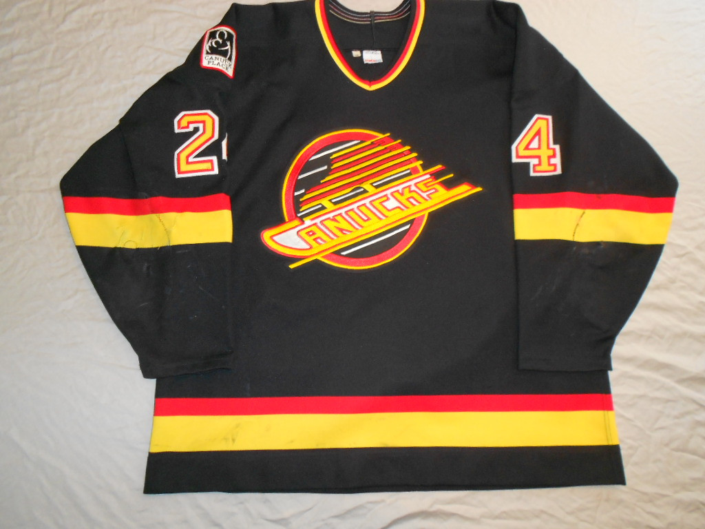 Beautiful jersey with awesome wear tagged size 54 in collar. Front has a few black stickmarks on the crest and also on the lower hem area. Both sleeves show nice wear with the left having 5-6 team repairs and the right showing six more repairs. Back of jersey shows nice puckering to the numbers and the fightstrap is still intact. Jersey comes with original LOA from the team. A real beauty if you like wear!