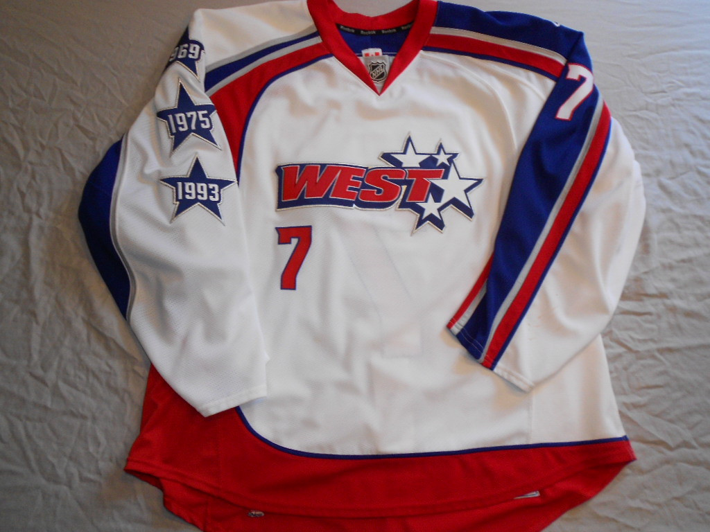 Loading... Please wait...Great looking All-Star jersey tagged size 58+ in collar. Front has the West crest sewn on. Right sleeve shows the years that Montreal was the host of the All-Star game in years past. Left sleeve has the All-Star patch and what looks to be a bit of blood just at the cuff area. Back of jersey shows the fightstrap is still intact and has the MeiGray Group tag in the hem which states jersey was worn in period number 2. Jersey comes with a Hockey Fights Cancer letter from the NHL also stating the jersey was worn in the second period. Great piece from one of only four American born players to score 500 plus goals!